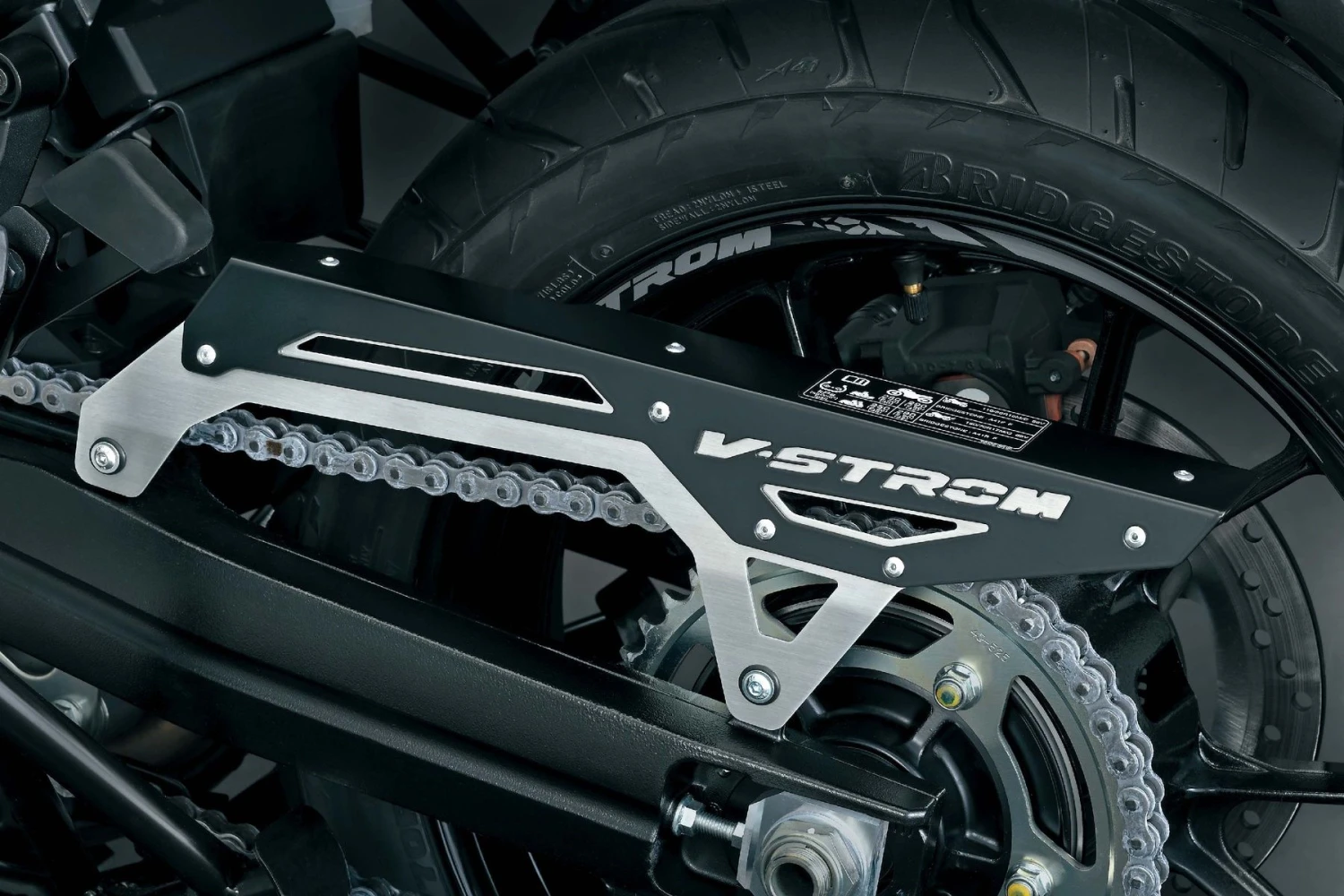 Zwart gepoedercoate aluminium kettingbeschermer met V-Strom logo voor V-Strom 1050DE.